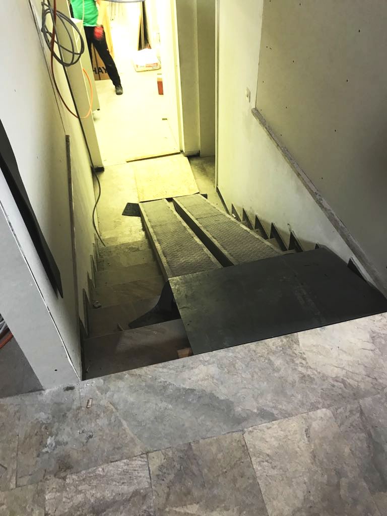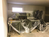 Doch wenn die Maschinen nicht - wie uns angeboten - sauber, frei und ebenerdig, sondern abgedeckt mit Planen, zwischen emsig hantierenden, unter Termindruck arbeitenden Handwerkern stehen (die absolut kein Verständnis für unsere Arbeit aufbringen konnten) und dann auch noch durch einen viel zu engen, gerade frisch renovierten Kelleraufgang transportiert werden müssen, (dessen Wände natürlich unter keinen Umständen beschädigt werden dürfen), dann geht es auch bei uns an die Grenzen des Möglichen.